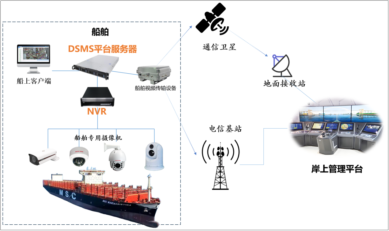 集光DSMS平台船舶智能视频监控通过安装部署在船舶的各个不同部位的前端高防护高智能的船舶监控专用摄像机,能够对船艏、船艉、左右两舷水域、船舶与泊位、船舶与船舶之间等区域多角度实时监控,对公共区域(甲板、机舱、走廊)、驾驶室、集控室、机舱、舵机舱等船舶重要场所进行实时有效的视频监控,并支持4G/5G、北斗、卫星通信等将所需视频传回陆地岸上,岸上工作人员通过陆侧监控指挥系统实时掌握船舶现场情况,进行全天候、全天时、无死角监控管理,实习危险预警高效处置、船舶航行运营高效管理,为水上船舶航行运输安全保驾护航。