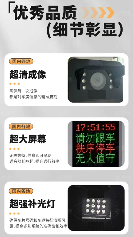 在车牌识别效率上,该一体机搭载了500W高清镜头,即使是异常车牌也能准确识别。高清镜头与红外灯配合使用,确保在下雨天和夜间等光线不佳的情况下,车牌依然清晰可见。此外,一体机采用了二值化算法、背景均一算法以及畸形变矫正算法,可有效解决因车牌污秽、过度曝光、光线不足以及阴阳车牌等情况导致的无法识别问题。